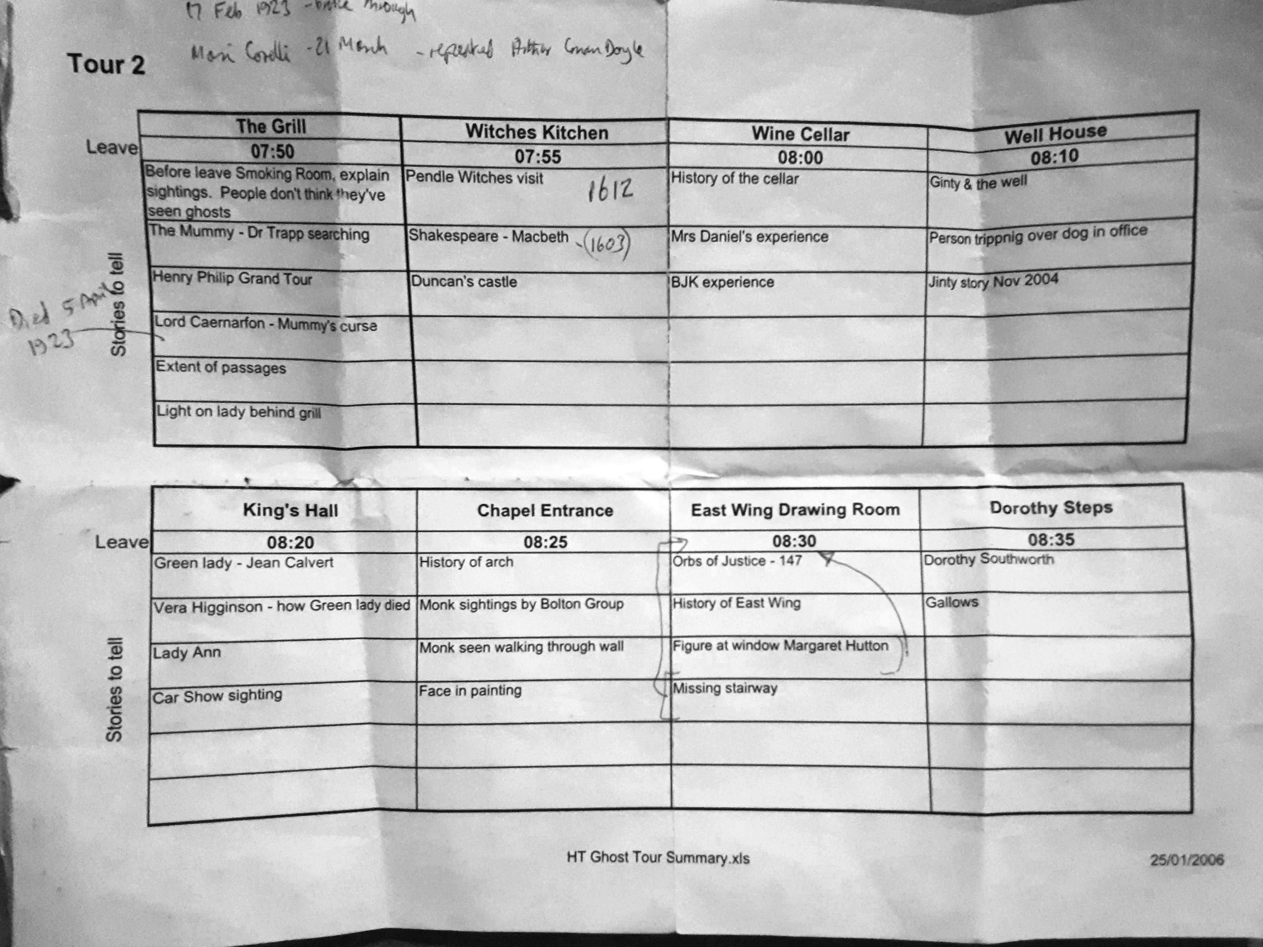 You may think that giving a ghost tour is no different to delivering a historical house tour, but it was very different. The guides were instructed to relate the chilling tales with a certain gravitas – not my usual flippant style – and so I dressed up like an undertaker, complete with long, dark coat and sombre expression. A house tour cost £3 in those days, and lasted about an hour. For the ghost tours, the Tower were charging £25 per head (including a meal), and about 60 people were simultaneously shown round in two parties of 30. The tours started together, but took different routes around the house and cellars such that the public never saw or heard the other party until the end, when (in theory) both groups entered the banqueting hall through opposite doors at the same time to hear the final stories.