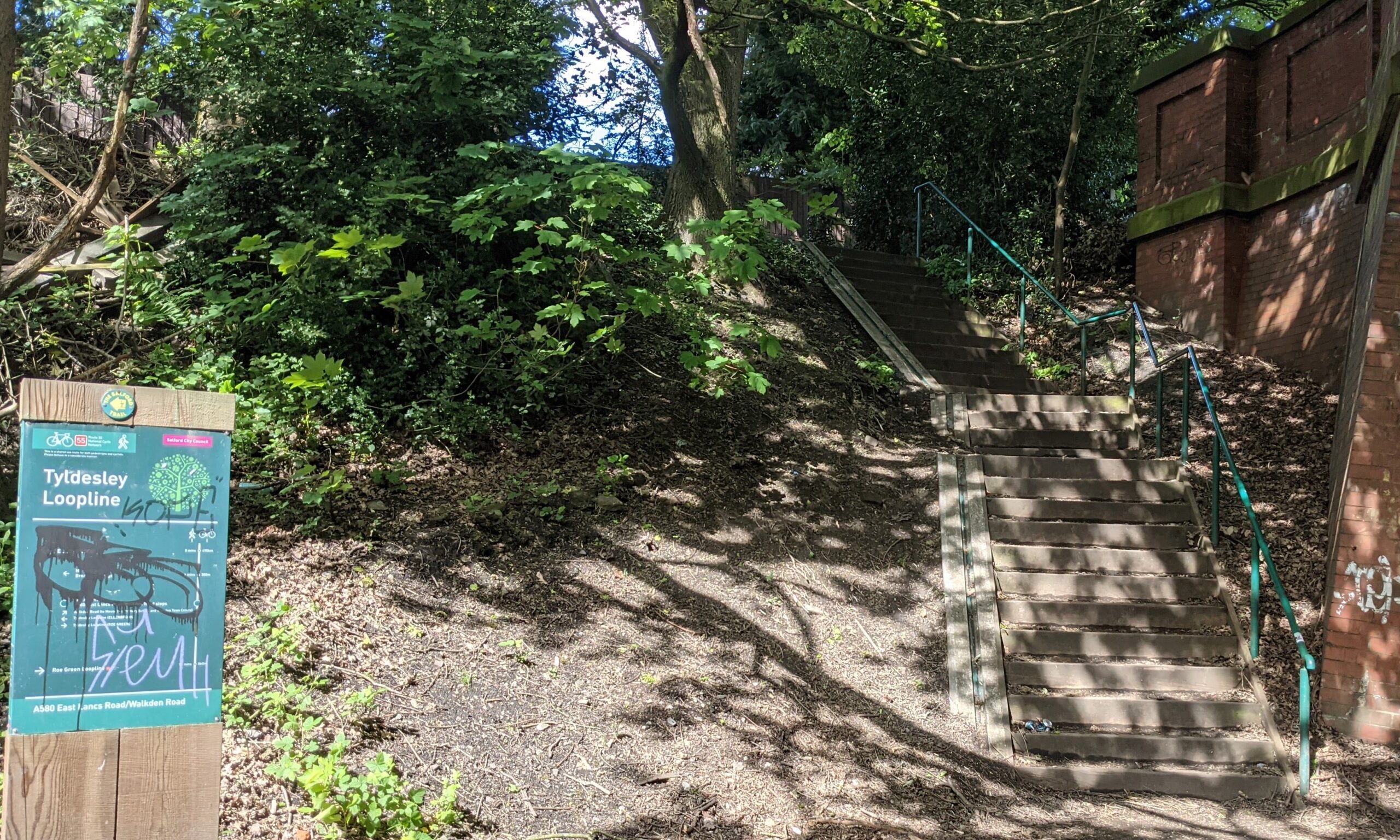 I started off a bit earlier than planned to try to get as far up the road as I could to beat the rain which was forecast for later, and the route through Stockport was much easier than coming in yesterday. It helped that my Garmin worked today and didn’t keep shrugging its metaphorical shoulders and saying ‘you took a wrong turning back there so you’re on your own now, pal’. The Trans-Pennine trail heading North confirmed to me that this route is really only for mountain bikes – it was very rough and not a little slutchy.