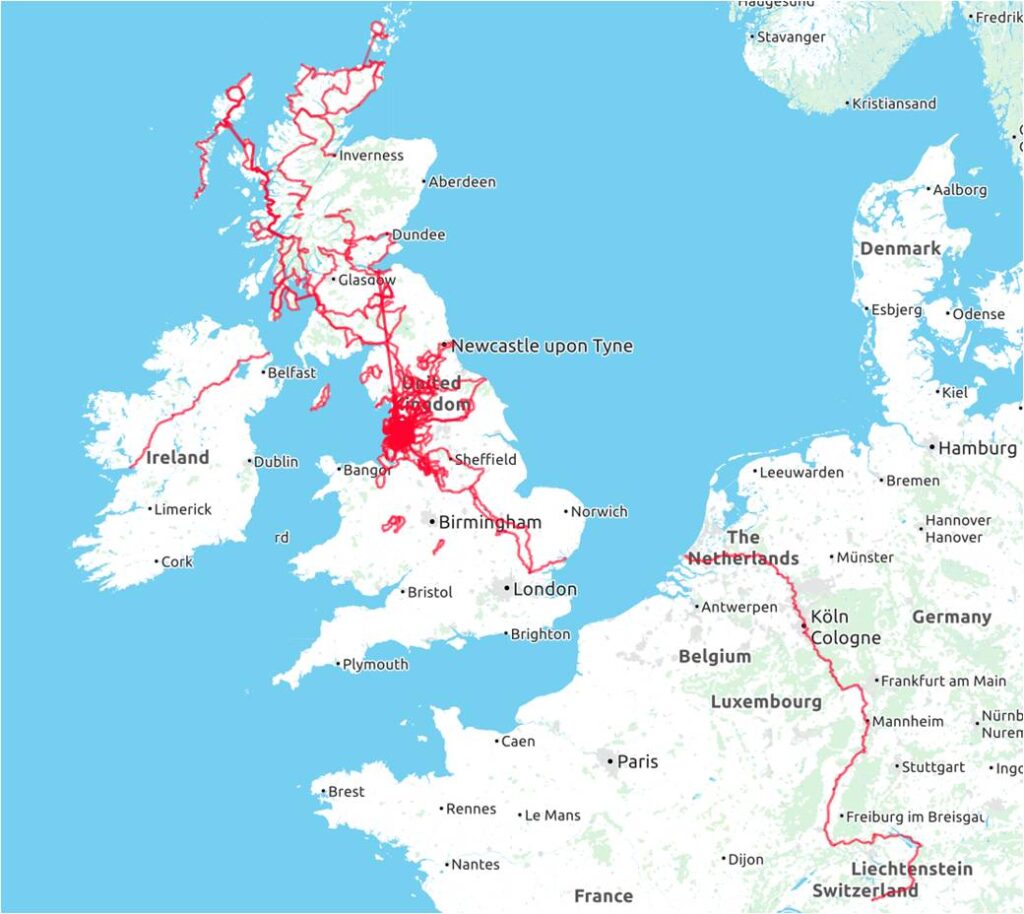 This trip also highlighted a problem with my Garmin navigation device that I didn’t manage to solve until weeks later.  Every now and then the Garmin simply refused to tell me the route to take, and more annoyingly, it beeped to say that it had lost the satellites and that I was off course.  (The first message was fair enough, but if it had no satellite signal, how did it know I was off course?).  Anyway, long story short, it turned out that my birthday present of a handlebar-mounted video camera was set too close to the Garmin and was affecting the signal.  I moved them further apart and peace was restored in time for my trip to Essex in August.  This tour was to fulfil a desire for me to have cycled a continuous route from Switzerland to the northern tip of the Outer Hebrides.  Sadly, I can’t claim a continuous route to the top of the Scottish mainland since I’m missing a five mile stretch between Kyle of Lochalsh and Auchertyre.  However, this’ll have to wait until I’m back in that region, since I can’t justify the 720 mile round trip to complete it.
