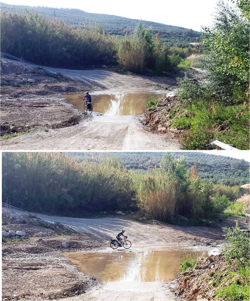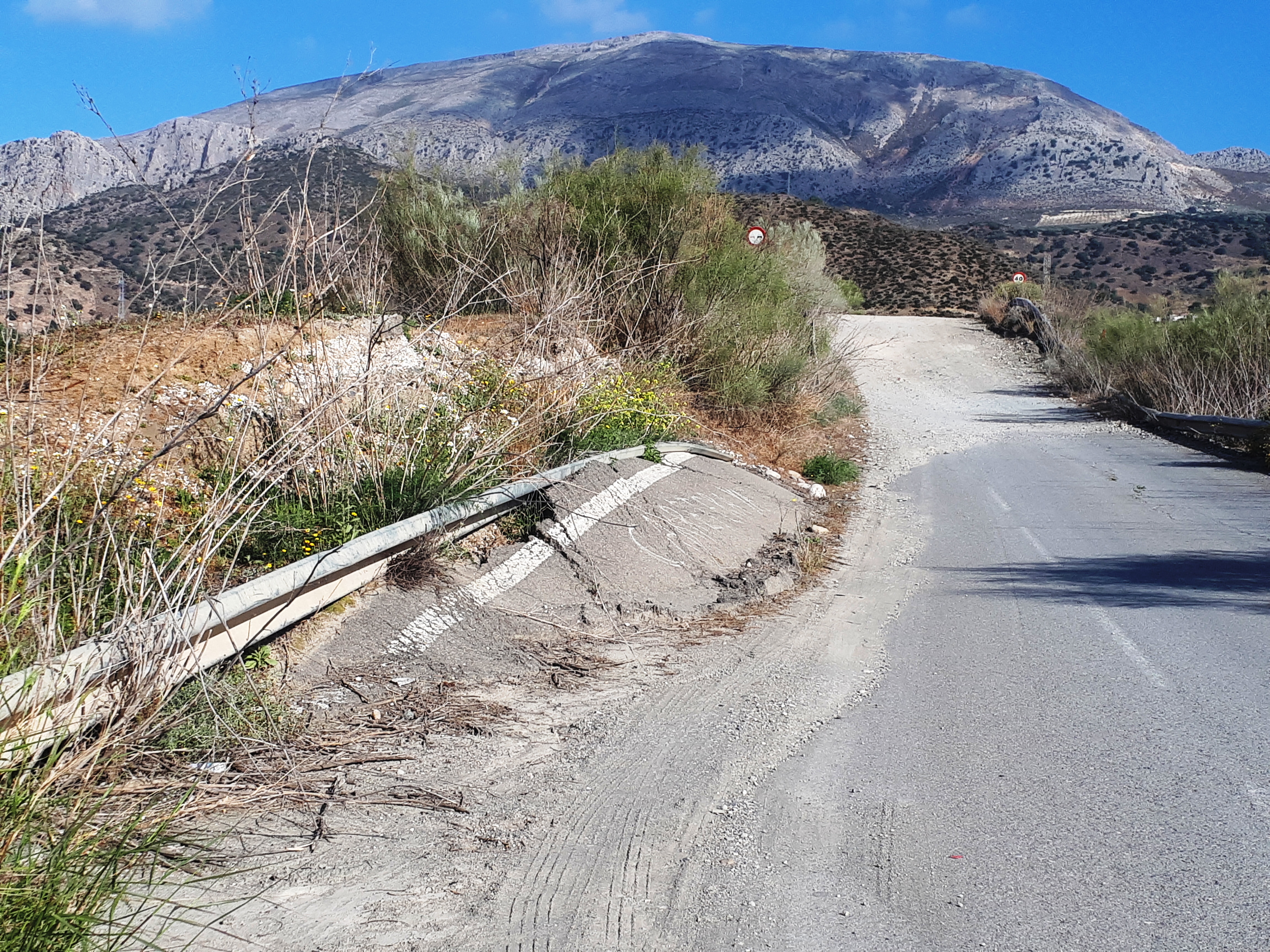 After a substantial breakfast (dinner last night was great too!), we started today with more climbing, including over 400 feet in the first mile! But then it was downhill for quite a long way along a road which appeared to have been subject to an earthquake. We managed to avoid the biggest crevices and navigated (quite literally) some very large fords before arriving in Álora again. Álora is a hilly town. Did I mention that? Very hilly. And today, all the hills were up.
