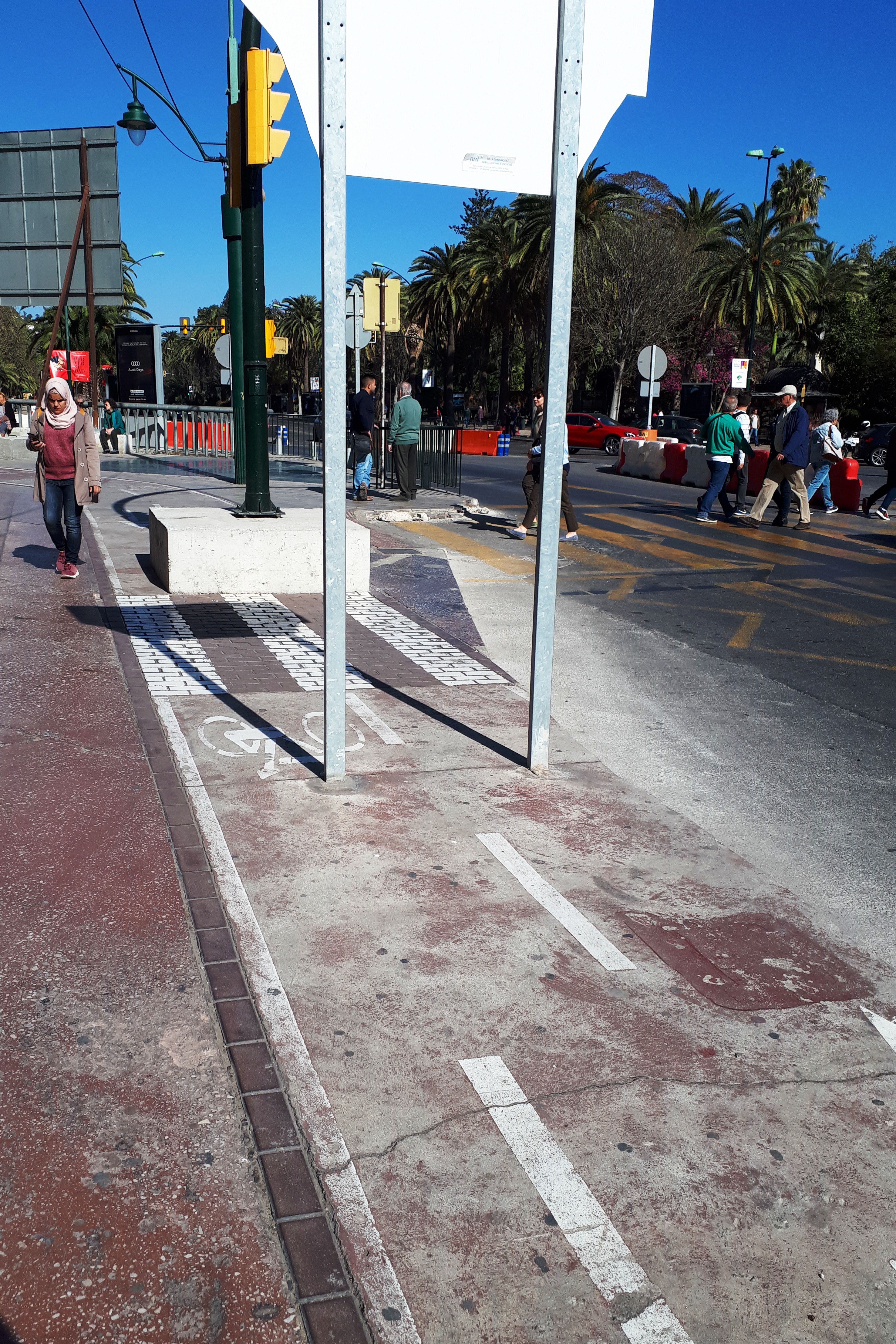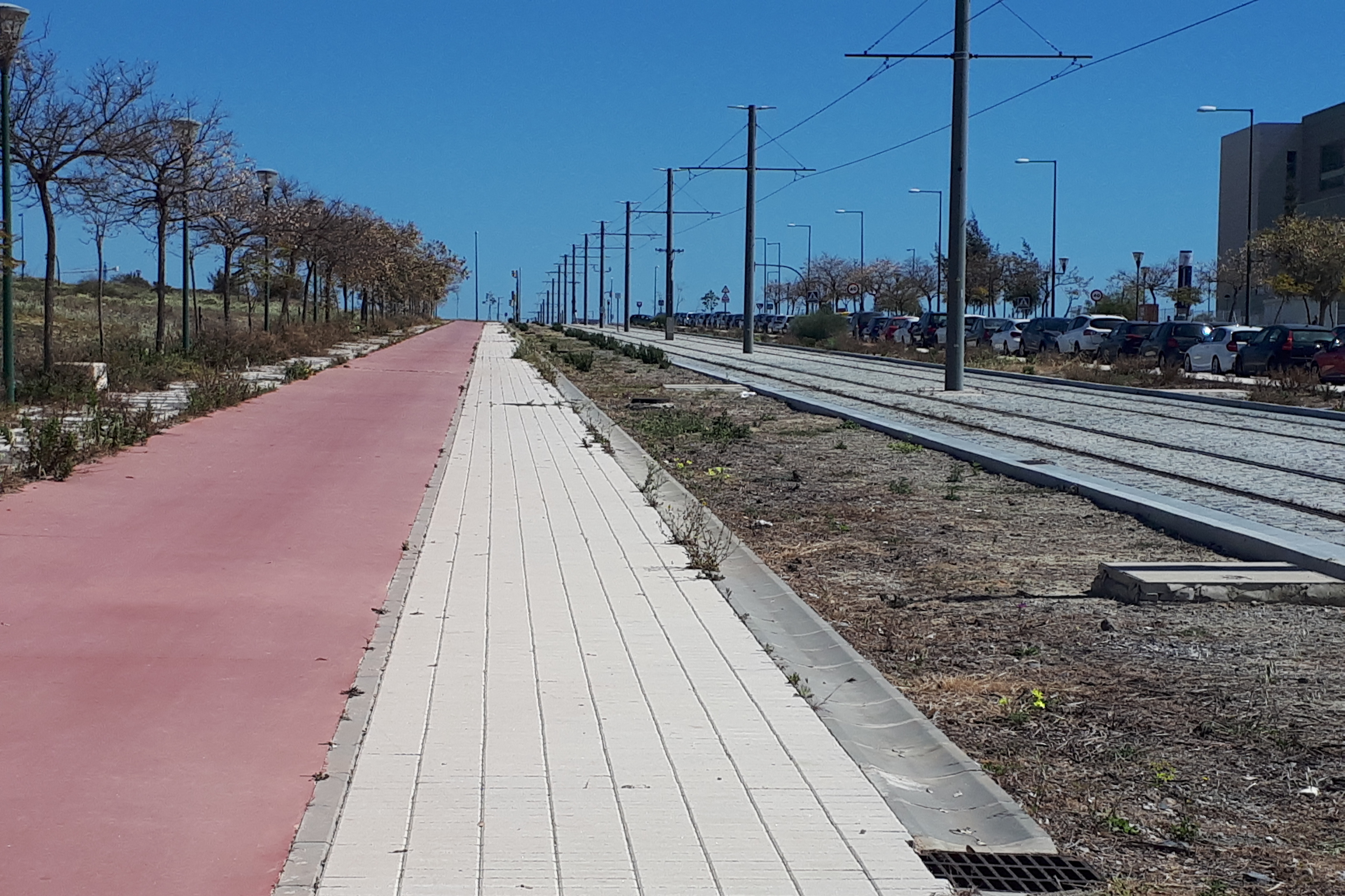 I can categorise the ride in thirds. The first third was marvellous – smooth tarmac, undulating just enough, great views, no traffic – whilst the middle third was just OK – flattish, suburban in parts, medium traffic. The last segment through Málaga was not nice – busy, noisy, and a bit scary in parts. I was following a route proposed by Garmin (yes, the same software that usually sends me down rough farm tracks) but this time, possibly due to the absence of any farms, it directed me by the new Escuela de Ingenierías Industriales, which I took to be an industrial engineering college. All brand new buildings and roads and not a soul to be seen!  And several new cycle tracks that just ended – no explanation or apology, they just stopped.  One ended at a tram stop which I guess was convenient for some.