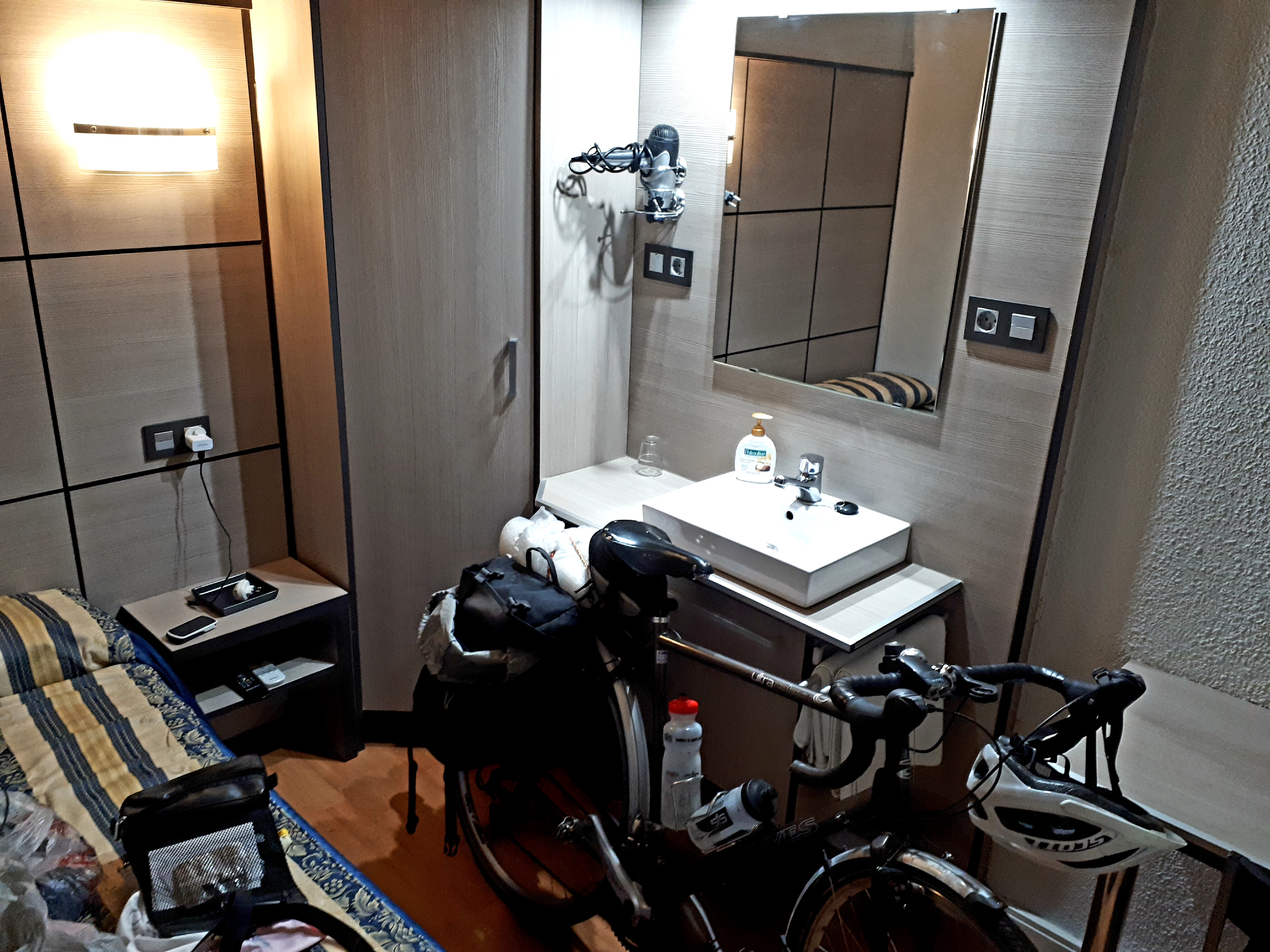 The Larios hostel (I was disappointed to learn that it’s named after the street, not the gin) is very clean, but situated in a pedestrian street and is three floors up, with a tiny lift that won’t hold a bike.  And my bike has to live in my room with me.  It’s very cosy.