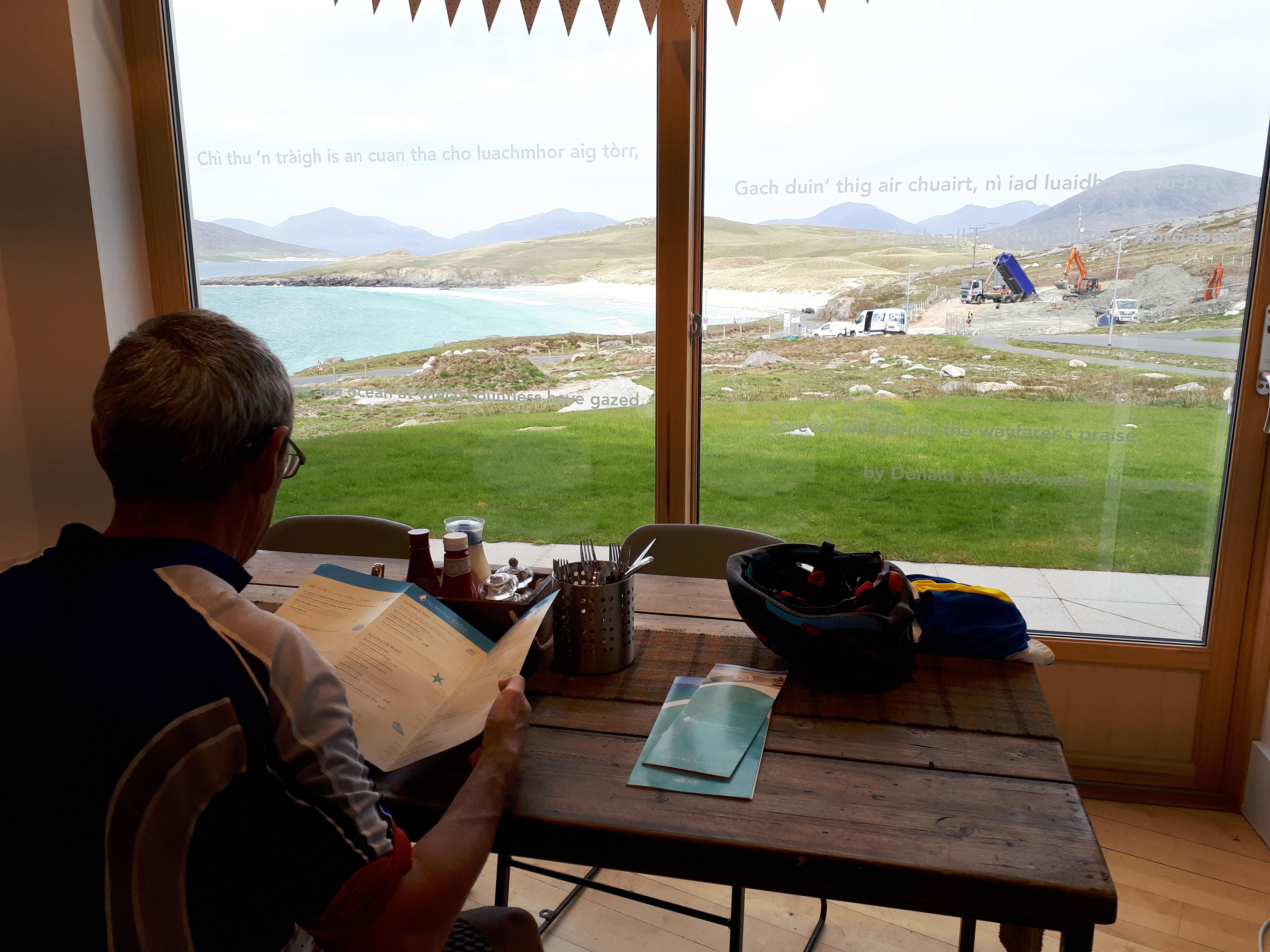 Taking a slight detour meant that I almost made us late for the meal booked at the Castlebay hotel: we were only 10 minutes late, but I can now claim to have ridden all the roads on the island. The meal was delicious, but expensive and even though we are on a tiny island, the one thing unavailable on the menu was the fish of the day. I ordered fish pie which presumably was not that day’s fish. Tasted OK, though.