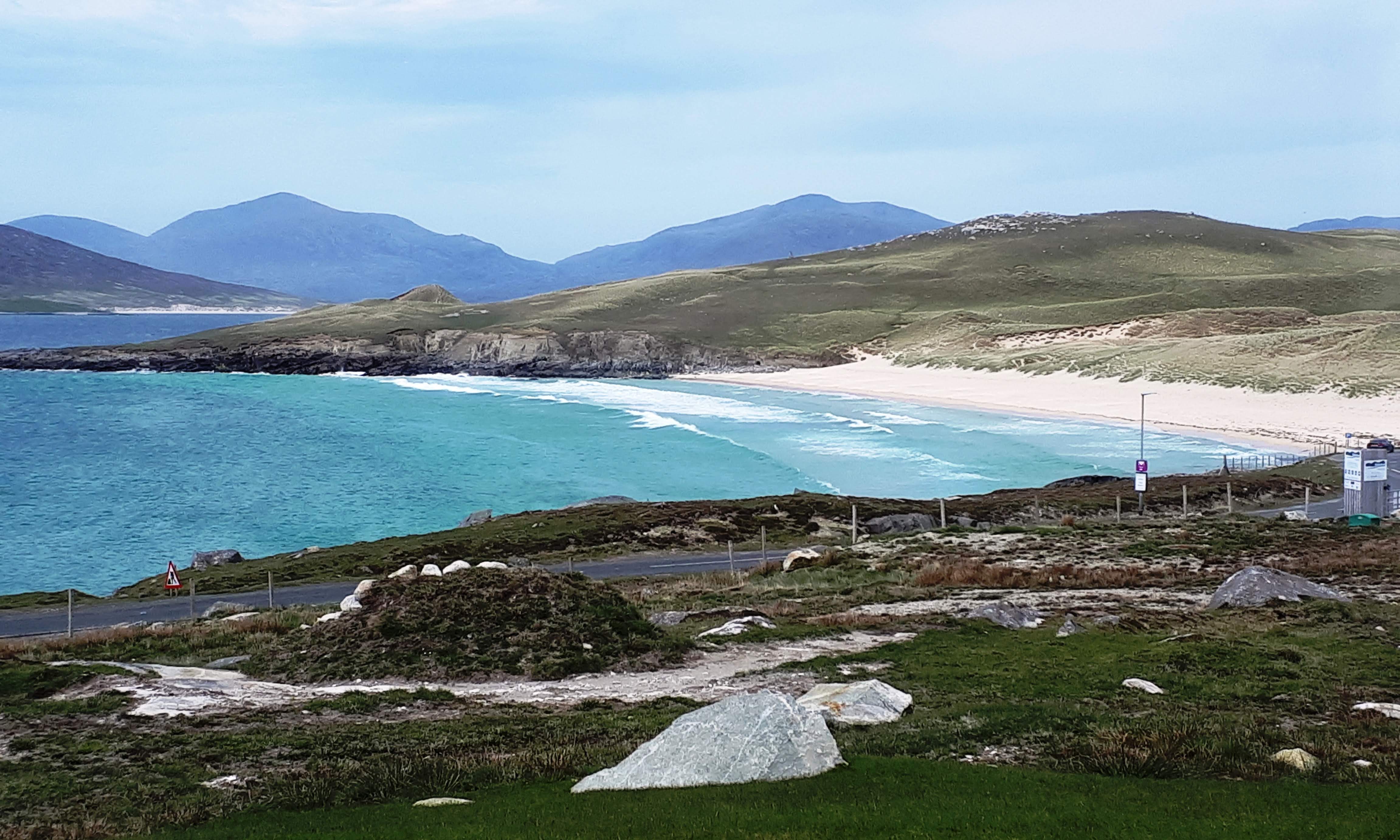 We were met off the ferry at Leverburgh (on Harris, island 7) by Nigel who happened to be staying locally. In duller conditions, we made our way north on some recently top-dressed roads. Note to self, and more urgently to Jim; riding fast downhill on half an inch of loose gravel is NOT recommended. Fortunately, grippy tyres, a bit of skill and loads of luck got us all down safely. To be fair, Nigel had ridden this road earlier and had warned us about loose chippings, but Jim though he said ‘loose chickens’ so he wasn’t that concerned.