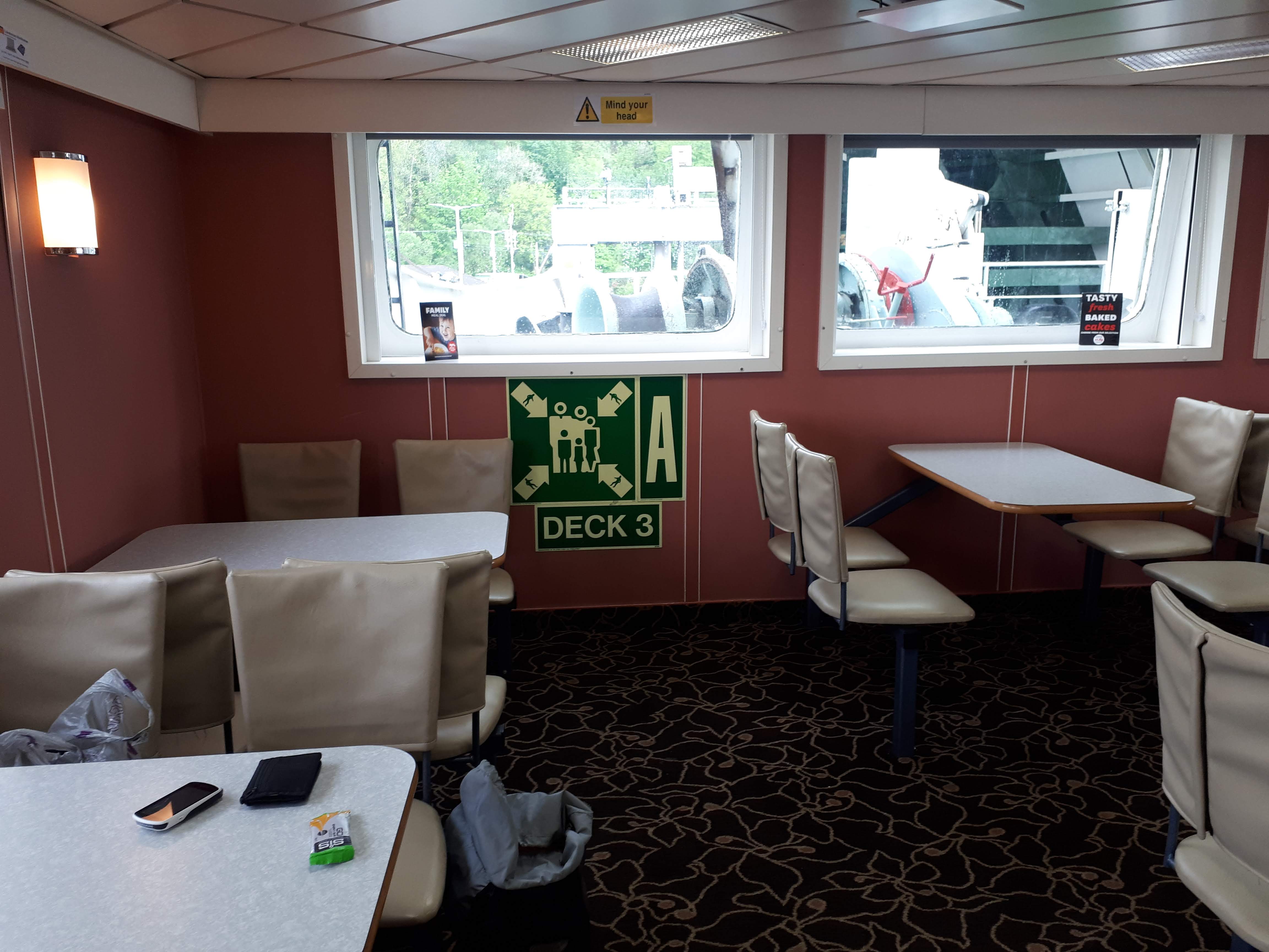 The crossing is fine, and the ship serves good beer and coffee (we had to try both before deciding which we wanted). I’m still trying to work out why there is a lonely man sitting in the place reserved for dogs even though he clearly doesn’t have one. Perhaps he just likes dogs and is hoping for someone to bring one to him. We’ve seen dolphins, but they were too fast (or shy) for me to capture them on camera.