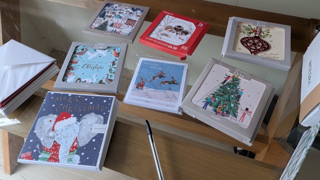 When I was working, by November I always seemed to have a day or two left over from my annual leave and I often spent one day writing Christmas cards. This is how I passed my time this morning while waiting for the temperature to climb above zero and it took me straight back to those days. I have recently donated what’s left of my old hi-fi and record collection to Emily so I had the old records spinning and I was having a great time.