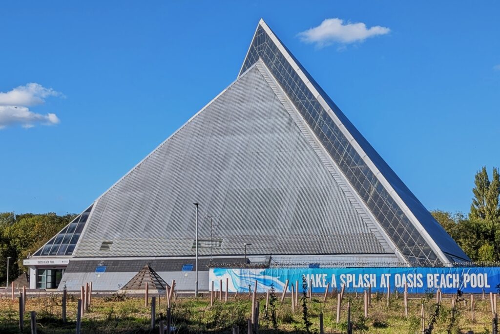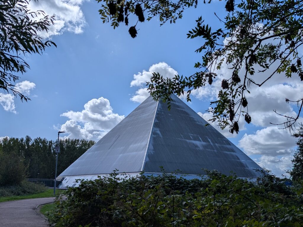 There’s a very interesting pyramid-shaped building in Bedford which apparently houses a swimming pool, but the business operation seems to have encountered difficulties and may even have closed. It certainly looked a bit sad as I cycled past today.