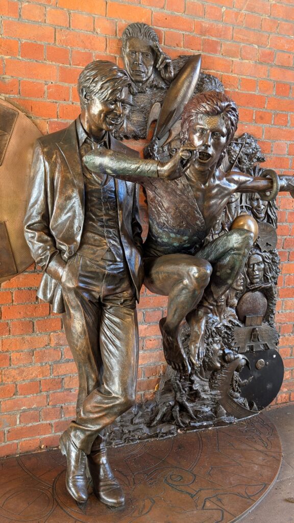 David Bowie was born in Brixton but there is a wonderful statue of him in Aylesbury. I was passing through the town today so I swung by to take a look. Why Aylesbury? Well it appears that he debuted Hunky Dory in 1971 and just weeks later launched his Ziggy Stardust persona at the town’s Friars Music club. Apart from this, a clock tower and a spectacular bridge over the railway line, the town is famous for its ducks, although I never saw any today.