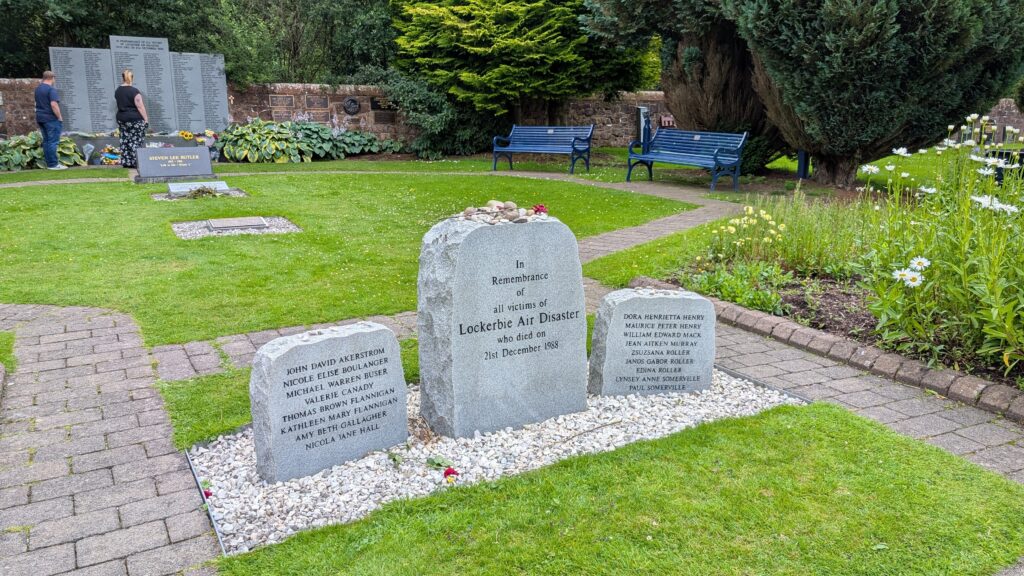 We then had an easy journey to Lockerbie passing through heavy rain along the way.  The first stop was at the Lockerbie Memorial Garden which was planted to commemorate the 270 deaths of the bombing of Pan Am Flight 103 in 1988.  The garden was in a cemetery a couple of miles from the crash site and was very moving and surprisingly busy.