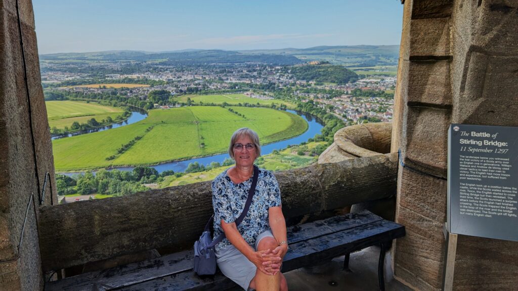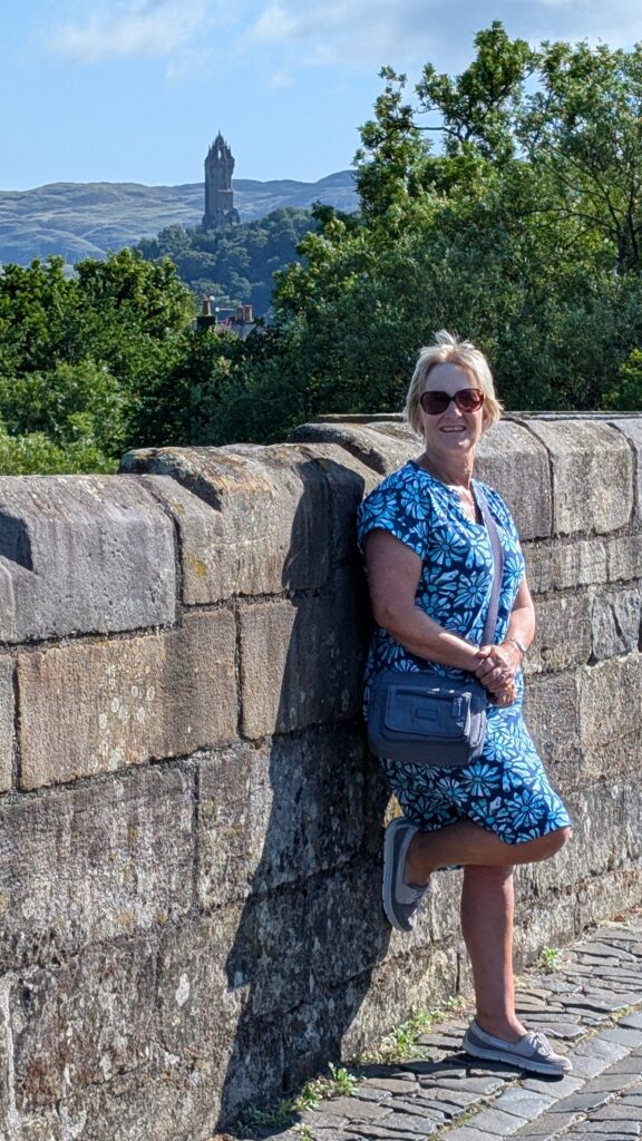 Gee on the Old Bridge at Stirling with the Wallace Monument in the background