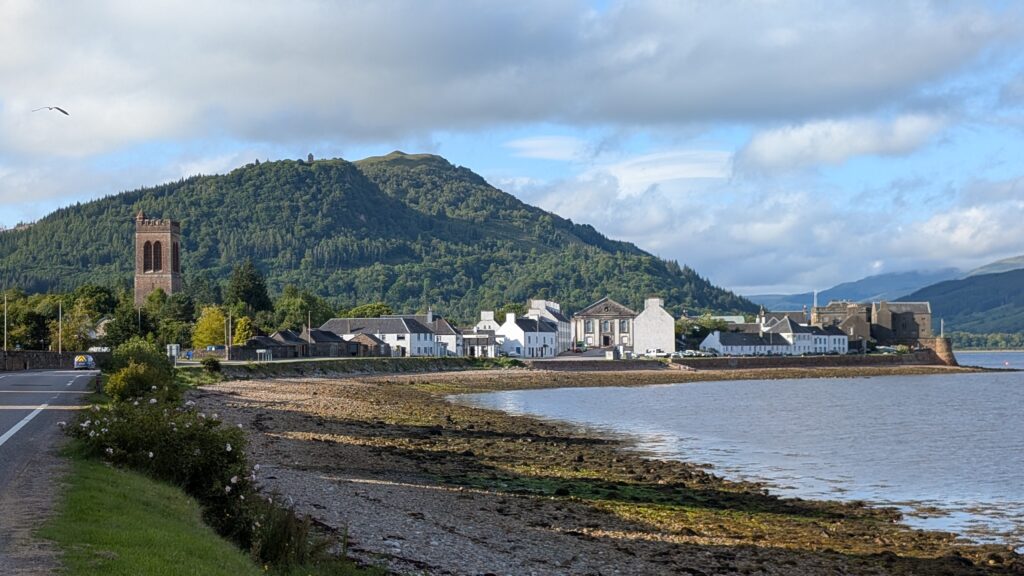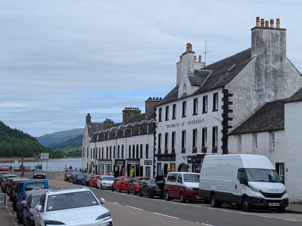 Tonight we’d booked into what I thought was a Country House Hotel in a cracking position beside Loch Fyne but when we arrived and parked up, we found it wasn’t quite what I expected.  It was very pretty, but there was no reception, just a self-check-in arrangement.  We spent time chatting to Crawford (the owner) who was a very interesting chap.  While we were there we got his life history and he also explained how the room-only basis of our booking was the only way he could make the place pay since he couldn’t find the staff to work there any longer.  Since there was no food offered, we booked in (sight unseen) at the Loch Fyne Hotel next door.   It was only when we checked the menu online that we realised that we’d have to pay way more than at home for the privilege of eating there.  My Aberdeen Angus burger was delicious and substantial, but at £22 it was rather on the pricey side.  It was also like eating in a kennels.  By the time we left, there were five dogs in our part of the restaurant.  Now I like dogs, but the humans were almost outnumbered.