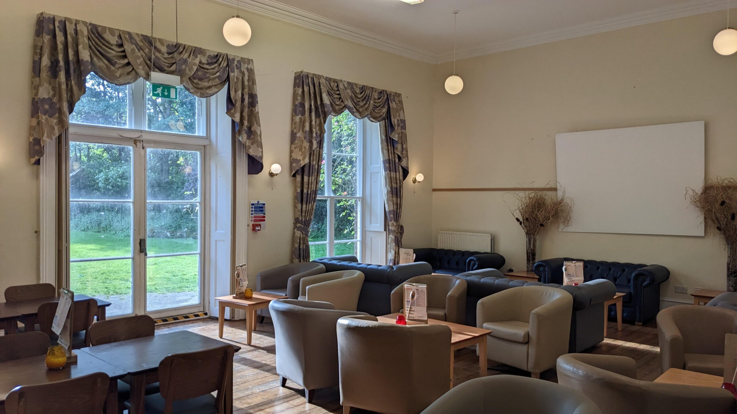 I’m now enjoying a pre-prandial drink before ordering food. The hostel has a coach-full of children in tonight, so the dining room is not available. Thankfully, there is an alternative in what they call the Ballroom! It is rather a splendid setting.